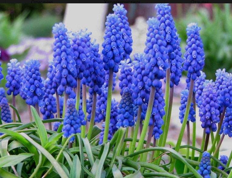 Армянский мускари (Muscari armeniacum), который в народе ещё именуют гадючьим луком или мышиным гиацинтом, относится к семейству Спаржевые и представляет собой невысокий многолетник. Его рост обычно составляет 10–15 см, реже — до двух десятков сантиметров. Листовые пластины — узкие, слегка утолщённые, с голубоватым налётом; кончики листьев элегантно изгибаются дугой и свисают. На одном экземпляре формируется от двух до четырёх таких листьев, причём длина каждого меньше, чем высота цветочной стрелки. Соцветие компактное, кистевидное, примерно 3–3,5 см, плотно укомплектовано мелкими бутончиками белой, синей либо небесно-голубой окраски. Запах умеренный, что весьма привлекает опылителей.
